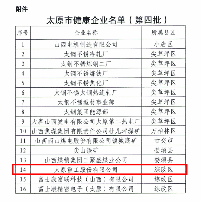 近日,太原市健康委員會公布了第四批健康企業(yè)名單,太原重工股份有限公司憑借卓越的健康管理理念和實(shí)踐成果,成功獲評太原市“健康企業(yè)”稱號。